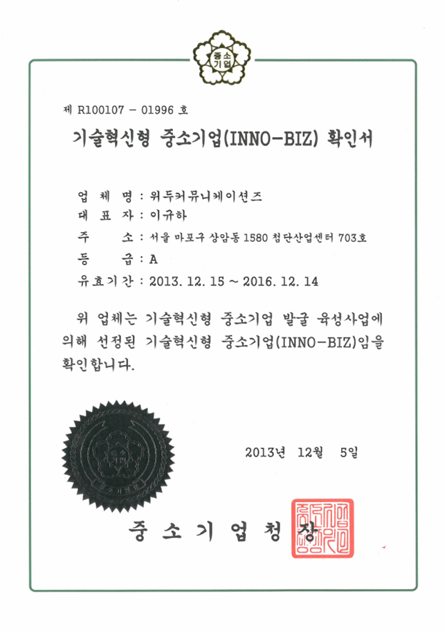 ㆍ 중소기업청 기업혁신형 중소기업(INNO-BIZ) 선정