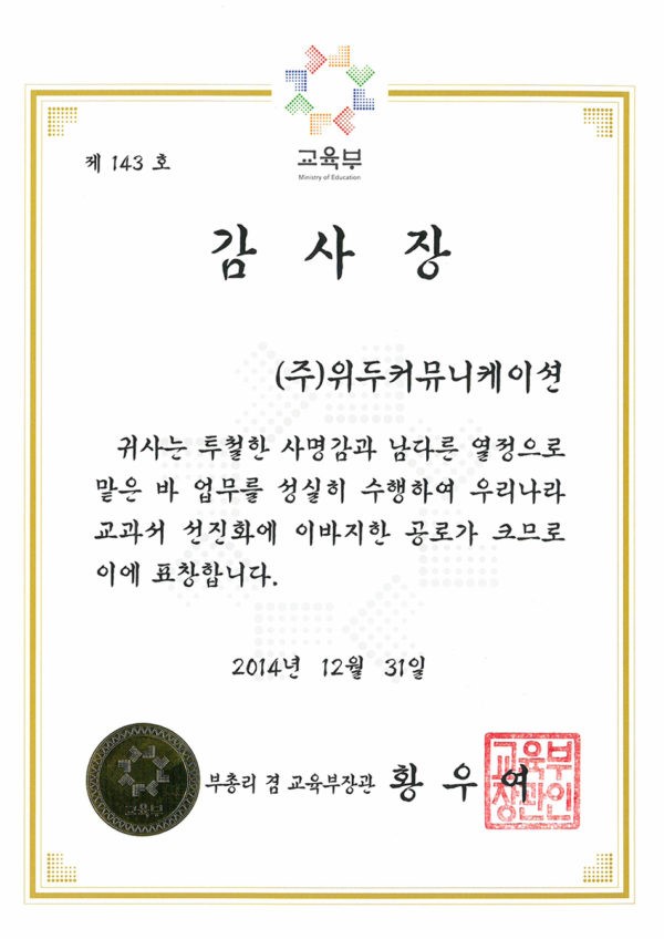 감사장 제 143호 페이지 정보 작성자 WeDu 댓글 0건 조회 5,765회 작성일 19-05-30 19:33 본문 2014-12-31 감사장 제 143호 교과서 선진화 부총리 겸 교육부장관 황우여 List Previous산업통상자원부 표창장 19.05.30 Next한국여성벤처협회 표창장 19.05.30