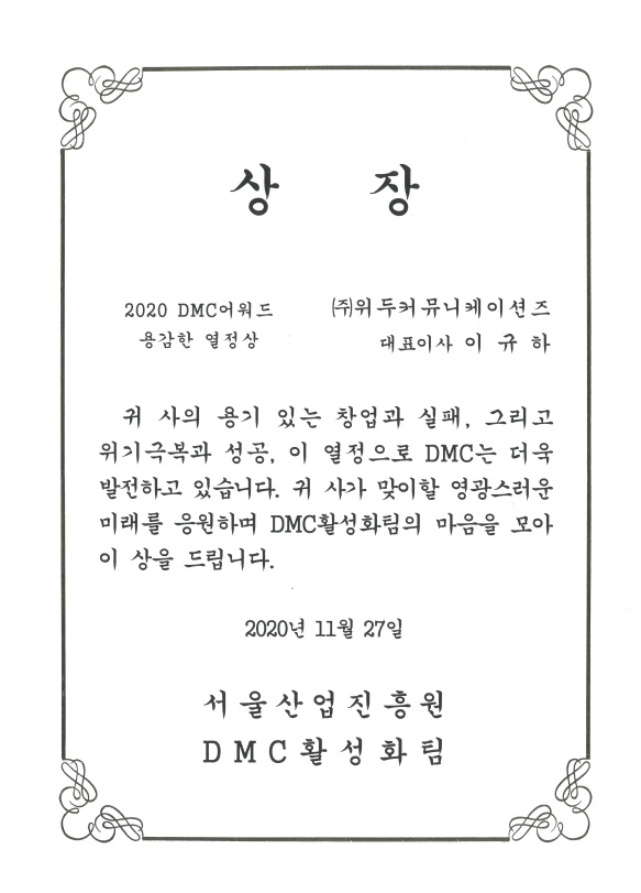 2020 서울산업진흥원 2020 DMC어워드 페이지 정보 작성자 WeDu 댓글 0건 조회 5,457회 작성일 21-12-31 12:57 본문 2020-11-27 2020 DMC어워드 용감한 열정상 서울산업진흥원 DMC활성화팀 List Previous2020 기술혁신 우수기업 21.12.31 Next2018 소년한국 우수 어린이 도서 19.05.30