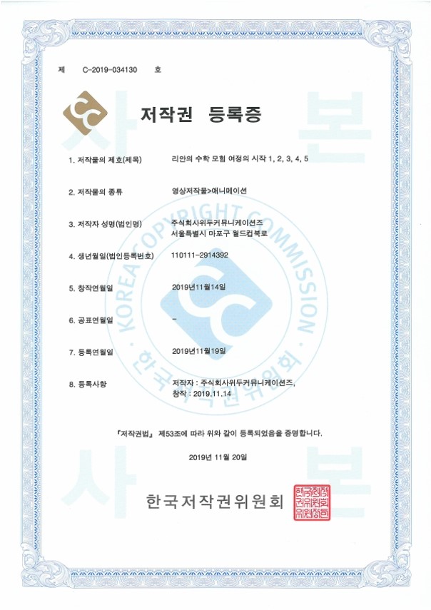 [한국/저작권] 리안의 수학 모험 여정의 시작 1,2,3,4,5 페이지 정보 작성자 WeDu 댓글 0건 조회 5,715회 작성일 21-12-31 12:36 본문 2019-11-20 저작권 C-2019-034130 영상저작물>애니메이션 List Previous[한국/저작권] OLL KIDS/MATH 21.12.31 Next[한국/저작권] 리안의 수학 모험 애니메이션 OST 19.11.25