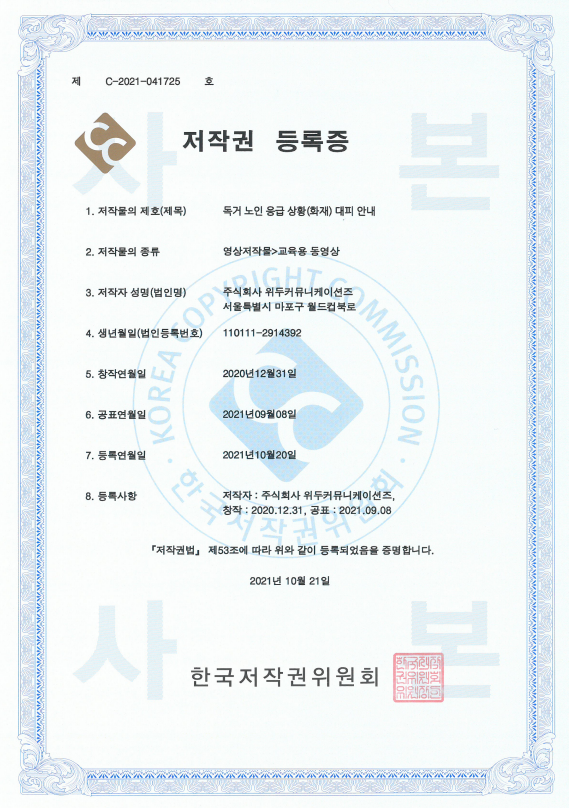 [한국/저작권] 독거 노인 응급 상황(화재) 대피 안내 페이지 정보 작성자 WeDu 댓글 0건 조회 6,157회 작성일 21-12-31 12:41 본문 2021-10-21 저작권 C-2021-041725 영상저작물>교육용 동영상 List Previous[한국/저작권] 장보기 인지훈련 게임 21.12.31 Next[한국/저작권] OLL KIDS/MATH 21.12.31