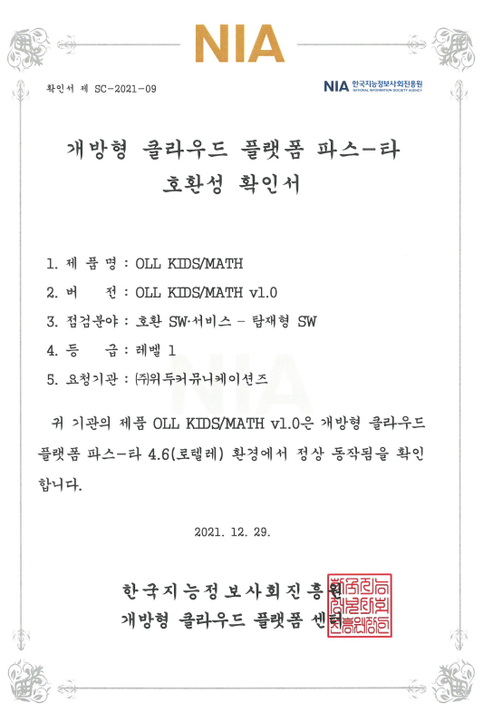 [한국/확인서] OLL KIDS/MATH 파스-타 호환성 확인서 페이지 정보 작성자 WeDu 댓글 0건 조회 9,664회 작성일 21-12-31 12:48 본문 2021-12-29 확인서 제 SC-2021-09 점검분야 : 호환 SW서비스 - 탑재형 SW List Next[한국/인증서] OLL KIDS/MATH 클라우드 서비스 확인서 21.12.31