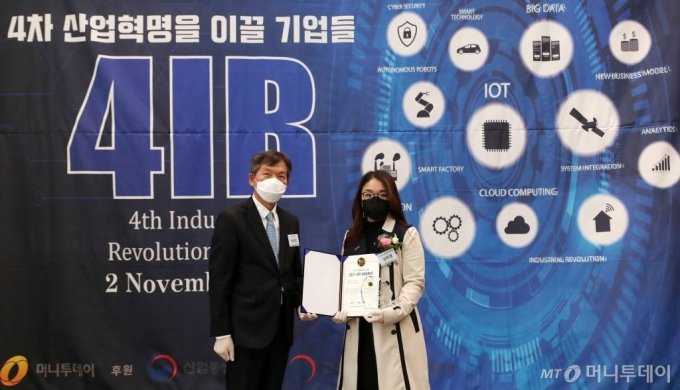 김미경 위두커뮤니케이션즈 센터장(사진 오른쪽)이 2일 오후 서울 중구 한국프레스센터에서 열린 머니투데이 주최의 '2021 제5회 4IR 어워즈(4th Industrial Revolution Awards)'에서 '초등 수학 교육 플랫폼'으로 '에듀테크 부문 대상'을 수상하고 정희경 머니투데이 전무와 기념 촬영을 찍고 있다.